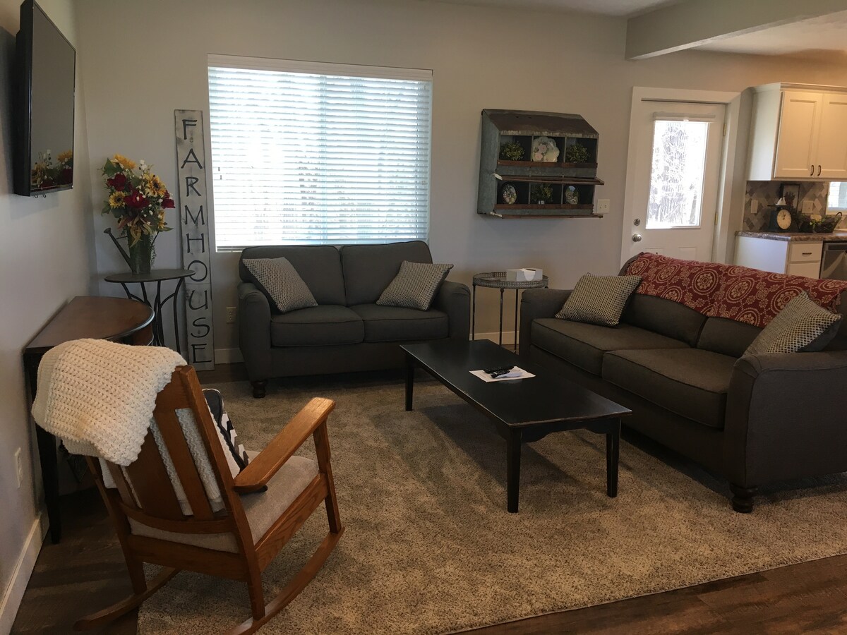 שופץ לאחרונה! בית החווה המודרני הזה הוא מקום מושלם לשהייה של משפחה או חברים. הוא מציע 2 חדרי שינה, חדר רחצה אחד עם אמבטיה/מקלחת, מטבח מרוהט היטב, פינת אוכל ומגודרת גדולה בחצר האחורית. חדרי השינה מציעים לישון 4 עם מיטת קווין סייז זוגית זוגית זוגית אחת. המטבח מצויד במלואו בציוד בישול ומכונת קפה Keurig עם כמה אפשרויות לבחירתכם. שימוש מלא בבית, מגודר בחצר האחורית ומכונת כביסה/מייבש לנוחיותכם.
