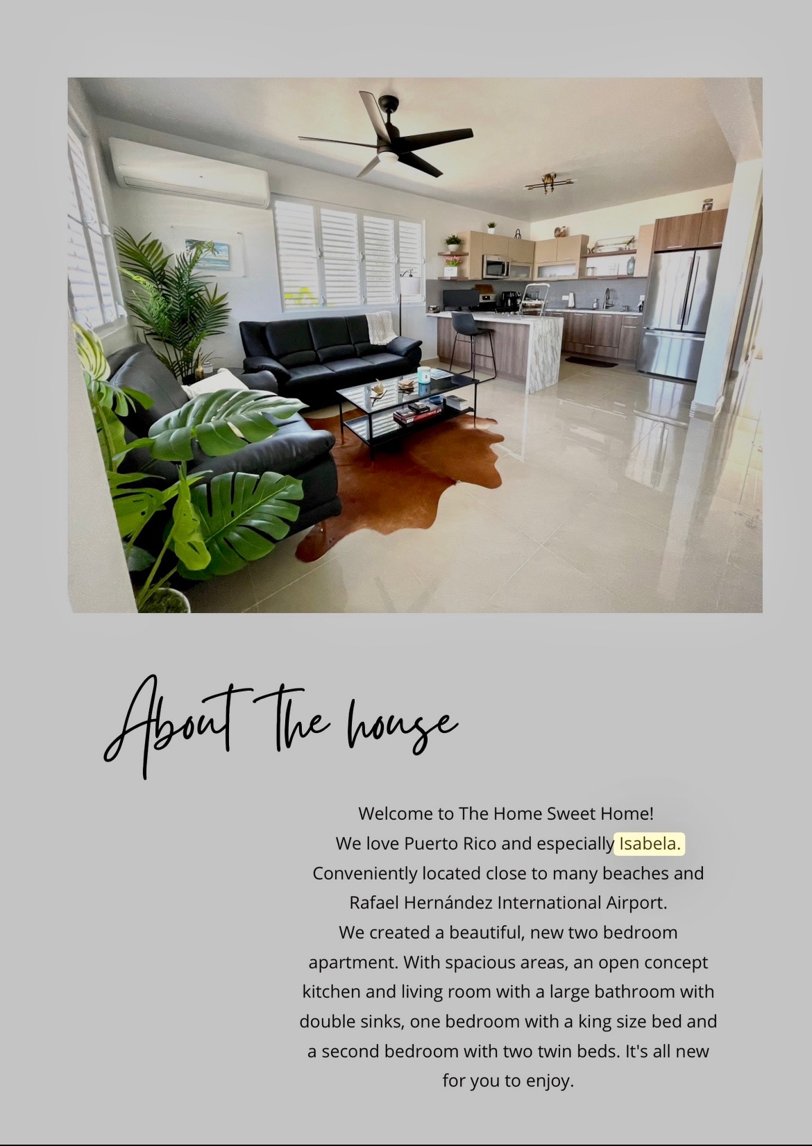 ברוכים הבאים ל - Airbnb בקומה הראשונה עם 2 חדרי שינה באיזבלה היפה, פ. ר. ממוקמת במרחק 15 דקות בלבד משדה התעופה BQN, החופים הטובים ביותר, גלישה, שנורקלינג ושיזוף. מקום הנופש שלנו מציע את השילוב המושלם של נוחות ורוגע. בכל חדר שינה מרוהט במיטות נוחות ומצעים מפוארים. תוכלו ליהנות מהמטבח המאובזר שלנו עם מכשירי חשמל מודרניים, כלי בישול וסלון שמציע מקום נעים. הזמינו את השהייה שלכם עכשיו וצאו להרפתקה מלאה בחום, ביופי ובזיכרונות יקרים.