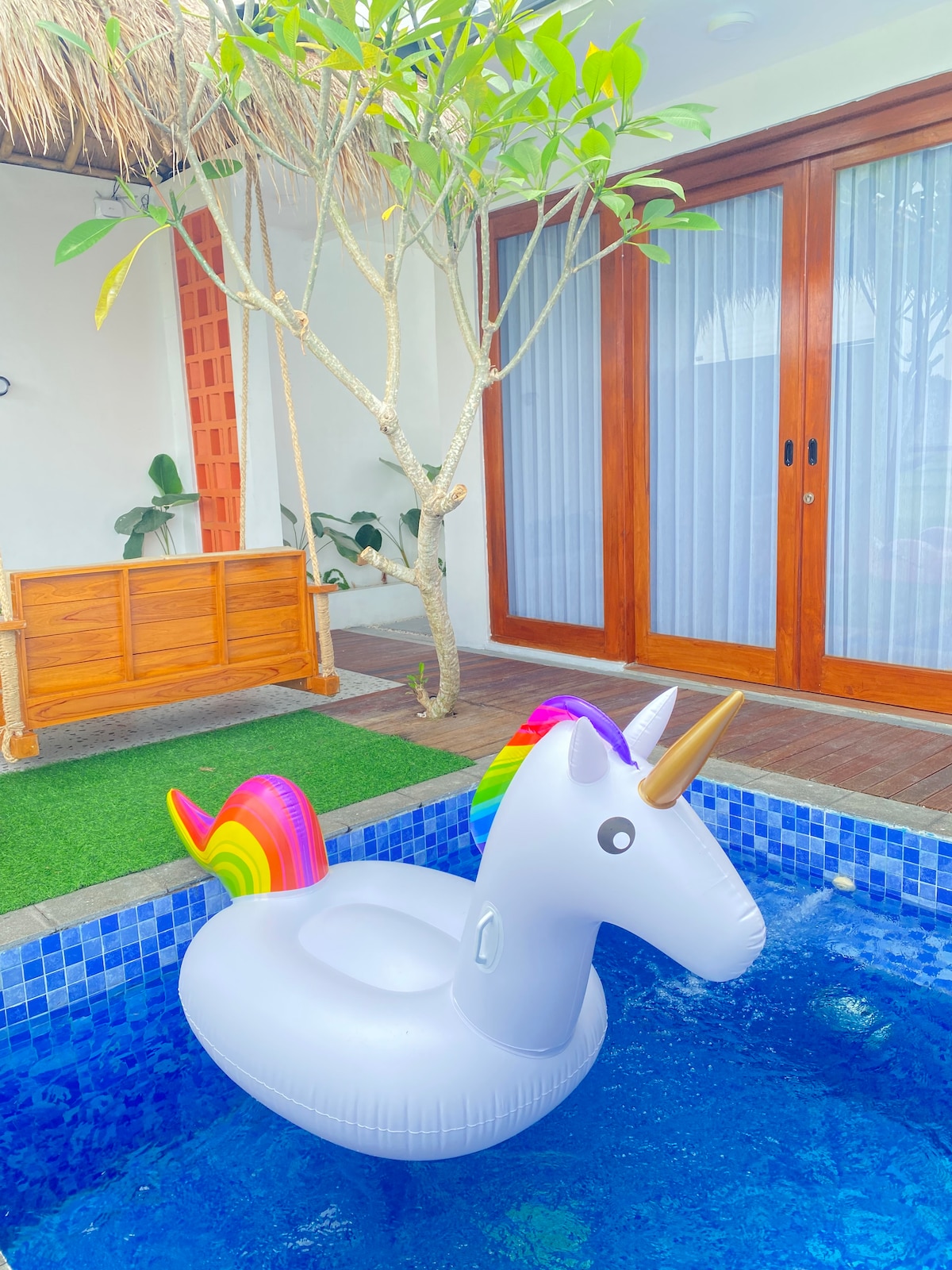 Aesthetic with Private Pool Suasana Tenang View Sawah & Pedesaan Akses Mudah Ramah Anak Fasilitas Per Villa / Kamar : -1 KING Bed size -Kolam Renang Pribadi -Smart TV -Mini Bar -AC -Teko Listrik -Kopi & Teh -Gua & Creamer -Meja & Cermin Rias -Balcon / Teras -Kamar mandi dalam with : Bathtub Air Panas & Dingin Shower Hairdryer Sabun & Sampo Toilet duduk 2 Towel Tissu Keset -Ruang Santai Keluarga -View Sawah