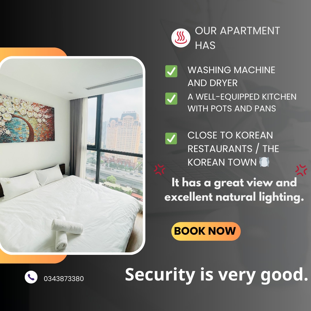 Tọa lạc trong khu đô thị Vinhomes Skylake Phạm Hùng – một trong những tổ hợp cao cấp và hiện đại bậc nhất thủ đô, căn hộ mang đến sự kết hợp hoàn hảo giữa riêng tư, tiện nghi và phong cách sống đẳng cấp. Căn hộ không chỉ là nơi lưu trú, mà còn là không gian sống lý tưởng, mang đến cảm giác như đang ở chính ngôi nhà của bạn giữa lòng Hà Nội . Mỗi căn hộ được thiết kế rộng rãi với: Phòng khách hiện đại, đầy đủ tiện nghi và phong cách Bếp trang bị đầy đủ thiết bị cao cấp.