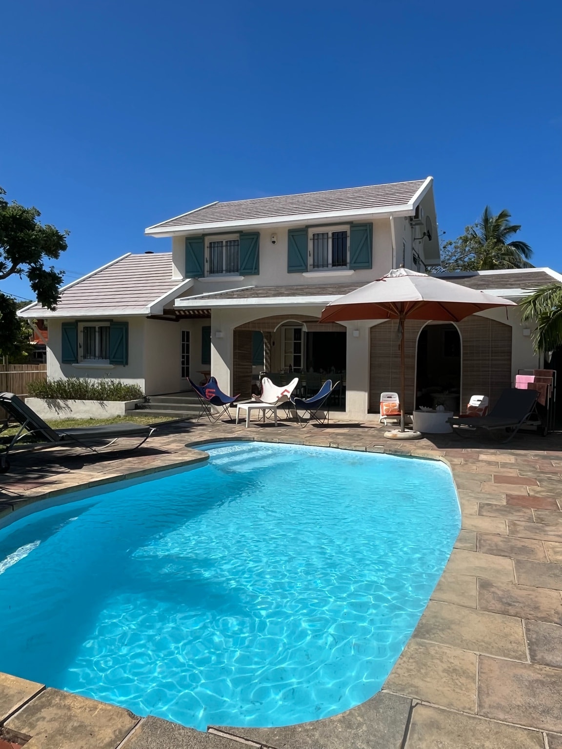 Located just off the beach in the beautiful and tranquil southern Mauritius area of Point D'esny. In a secure gated residence, this luxurious villa is the perfect place for a family vacation, for up to 6 persons. With 3 air-conditioned bedrooms and en-suites ,fully equipped kitchen, outdoor pool, dining area/veranda, quaint garden surrounded by exotic fruits and scents alike. Everything you could want or need for an opulent escape within 1 minutes walk from an idyllic white sandy beach.