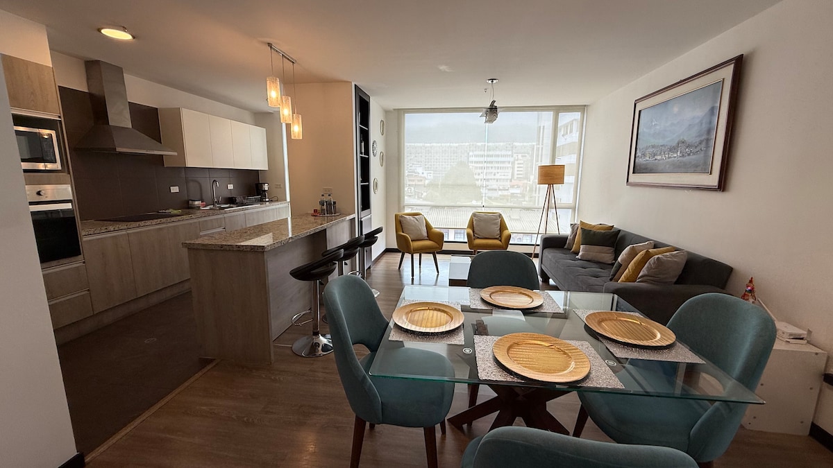 Our suite is located near "La Carolina park", 25´minutes from "Quito´s Historic center". The building has two entrances, swimming pool, sauna, Turkish bath, jacuzzi, game room, gym, yoga room, BBQ area, panoramic terrace, cinema, events room; available spaces prior reservation. The suite has a fully equipped kitchen, living room and dining room, washer - dryer, two tv's, two bathrooms, one shower, high speed internet. 12th floor. Parking available.