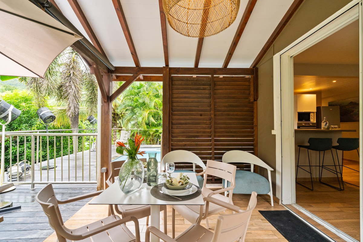 Welcome to your vacation studio, in the heart of a small leafy property just a few steps away from Pointe Marin beach. Freshly refurbished with a natural ambiance, this apartment is perfect for travelers in search of disconnection. For total independence, it has a fully equipped kitchen and a washing machine. Finally, its wooden terrace is ideal for meals to birdsong or to enjoy a cocktail after an exhausting day at the beach.