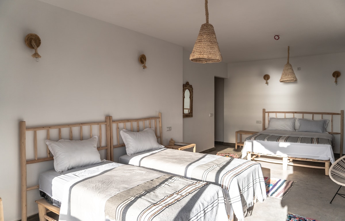 חדר אלגנטי "Mouja" במגורי Surfpalmexpo: לגלות את החדר החדש שלנו עם נוף לחצר, מעוצב בסגנון ברברי אותנטי. תיהנו ממיטת קינג סייז, עם גג נפתח לשתי מיטות יחיד וחדר רחצה פרטי. גישה למטבח וגג משותפים, מושלמים כדי ליהנות מרגעים רגועים ולהתפעל מהאוקיינוס. מקום שבו מסורת ונוחות מודרנית נפגשות כדי ליהנות משהייה ייחודית. לפי בקשה: ארוחת בוקר וארוחה שיעורי גלישה והשכרה