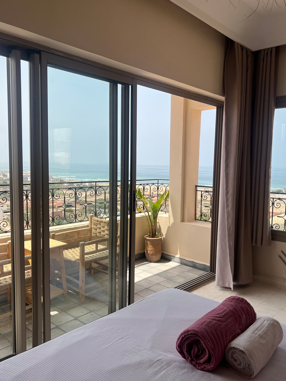 A spacious 55m² Moroccan-style apartment with large windows and a private balcony offering a beautiful ocean view. It features a double bed, salon with large sofa, TV, fully equipped kitchen, private bathroom with shower, good Wi-Fi high spped, a work desk, and a small fridge. Perfect for couples, families, and surfers, ideal for memorable vacation and productive remote work.
