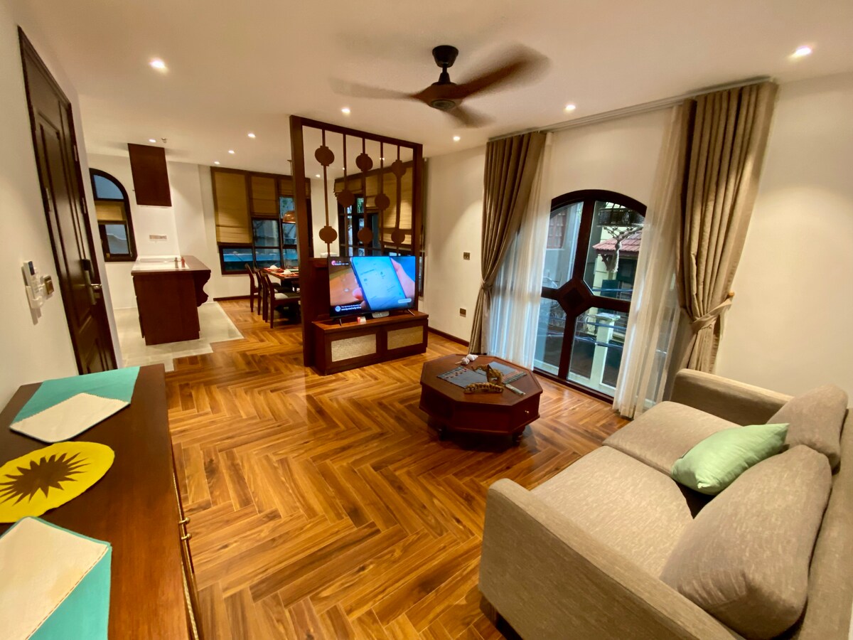 This beautiful apartment in Tay Ho is located on the 6th floor of our new building - Hanoi Housing 32. It has one bedroom, one bathroom, and an open livingroom-kitchen. It is nicely designed. Full modern furniture and equipment is provided. The wooden floor helps the apartment easy to clean. Moreover, the building's location is within walking distance to convenience stores, restaurants, shops, bars, pubs. Please note that there is no natural light or balcony at the apartment