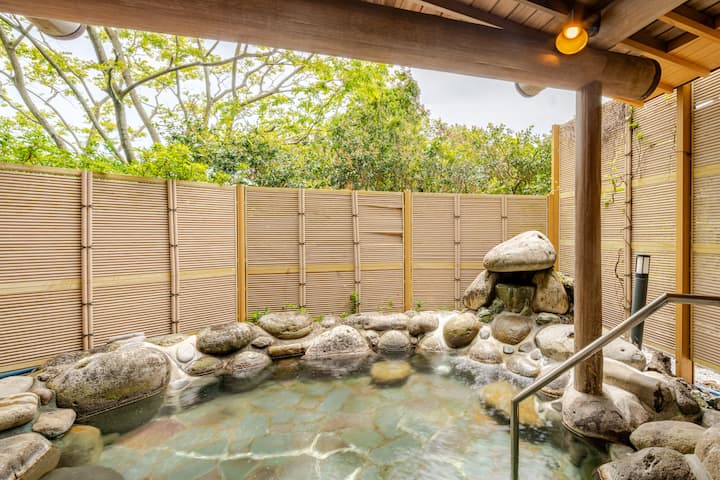 Onsenyad Hanamizuki Izuki Kowgen is located near Izu Guranparu Park, a luxury rental villa with natural hot Springs limited to one group per day.חלל מרגיע בשטח בניין 4500 מ"ר 720 מ"ר.מצויד במלואו באמבטיה באוויר הפתוח, סאונה, קריוקי, תנור פיצה, אזור מנגל ועוד.נישיקיגוי שוחים באלגנטיות בבריכת הגן.ליהנות מזמן רגוע.