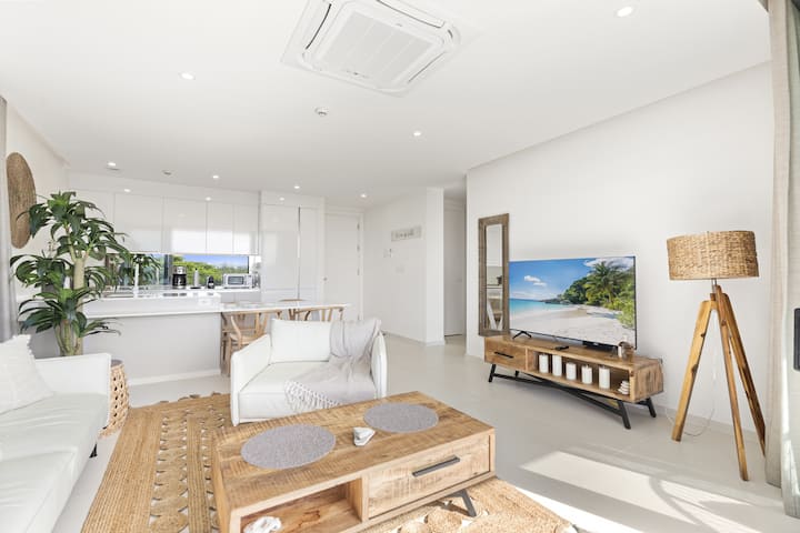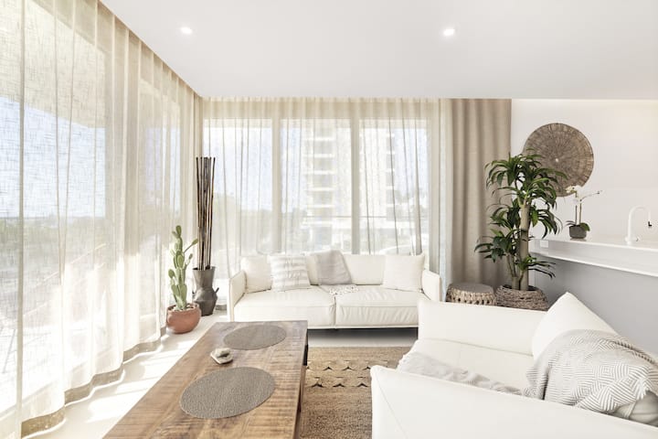 כשאתם נכנסים לדירה, אתם תהיו מוקסמים באופן מיידי מהתערובת החלקה של אלגנטיות מודרנית וקסם חופים. אזור המגורים הפתוח מתגאה בריהוט בטוב טעם ובעיצוב מסוגנן, ויוצר אווירה של תחכום שמשלימה בצורה מושלמת את הנופים עוצרי הנשימה ממש בחוץ. אור השמש זורם דרך החלונות הגדולים, מטיל זוהר חם על החדר ומדגיש את נוף החוף המדהים המשתרע לפניכם.