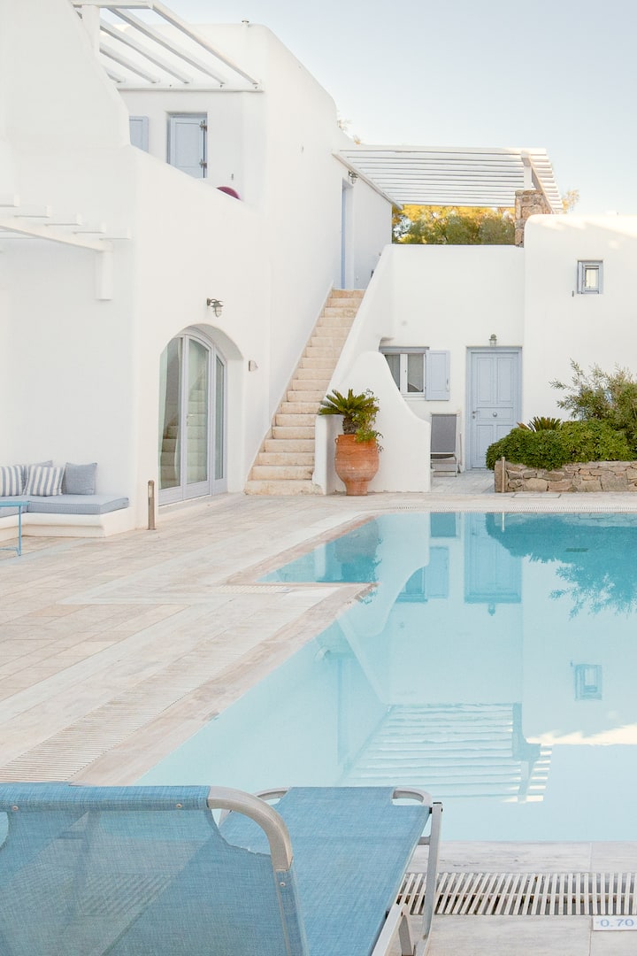 תוכלו לשבת מתחת לשמיים היווניים על מרפסת פרטית המשקיפה על הבריכה המשותפת הנוצצת במתחם וילות קיקלאדי אותנטי בגיר לבן. דירה זו בקומת הביניים הייתה לבושה בלבן עם גוונים לבנים של בז 'וכחול.