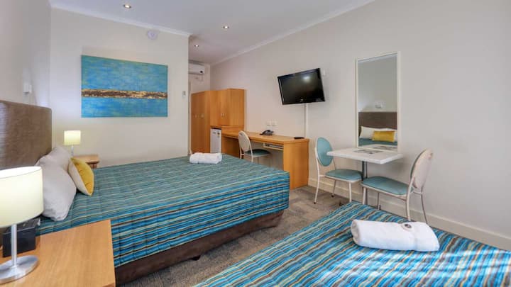 חדר זוגי במוטל עם מיטת קווין סייז אחת ומיטת יחיד אחת