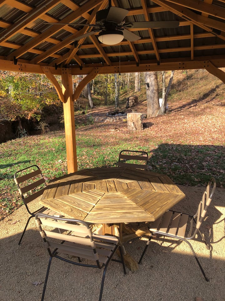 Covered Gazebo עם מאוורר תקרה, חשמל ושולחן אוכל.