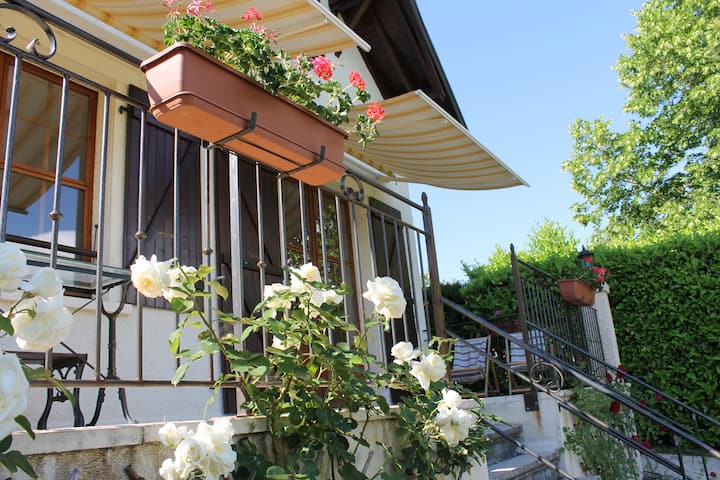 גרנו בכמה אזורים בצרפת, אבל בסבואה העילית יש הכל - קיץ, חורף, אביב וסתיו! התאהבנו ב -" Maison bourgeoise annecienne "הזה והחלטנו לשפץ אותו ב -2002 כדי ליצור את בית המשפחה שלנו. אהבנו במיוחד את הסגנון האדריכלי של הבתים האלה שנבנו עבור הסוחרים העשירים של אנסי בשנות ה -20 וה -30, שרצו נופש כפרי קרוב למרכז העיר. הבתים נבנו במקומות שבהם הסוחרים יכלו ליהנות מהנופים הטובים ביותר של ההרים ויש להם גנים גדולים יותר ממה שהיה אפשר במרכז. עם נופים ורוגע, הבית עוצב עם חלונות ענקיים בסלון ובחדר השינה הראשי, הפונים דרומה לאלפים וגינה פרטית שטופת שמש, עם שפע של מקומות מוצלים לנוח בהם באחר הצהריים החם של הקיץ. שחזור הבית הכפרי הזה משנות ה -30 נתן לנו הזדמנות לחשוב איך לשלב אותנטיות עם ידידותיות לסביבה. מאפייני העץ הם מקוריים, החימום הוא על ידי משאבת חום לחיסכון באנרגיה והבאר המקורית והשפעת הם חלק ממערכת החלמה תת קרקעית של מי גשמים, המשמשת להשקת הגנים, לאסלות ולשירותים למכונת הכביסה. אנחנו מאמינים שתוכלו לשמור על קסם מיושן ולהיות גם ידידותיים לסביבה! קיבלנו עזרה ותמיכה רבה בפרויקט השיפוץ הזה של השכנים שלנו בכפר, אז קרא לבית שלנו 'La Maison de Proméry '.