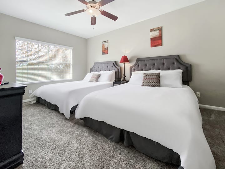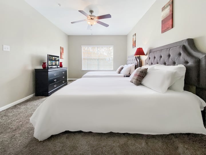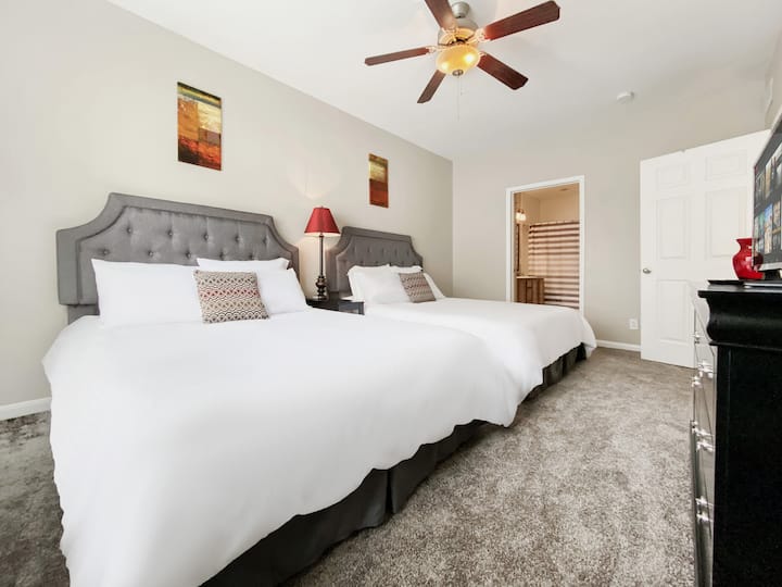 2 חדרי שינה→ מרוהטים עם 4 מיטות קווין סייז ו -2 חדרי רחצה מלאים עם אמבטיה/מקלחת בסגנון גינה.