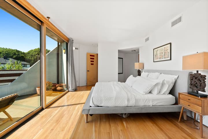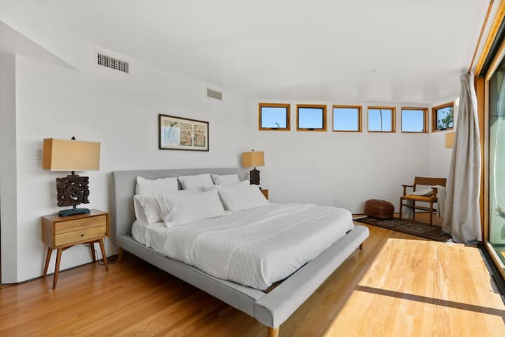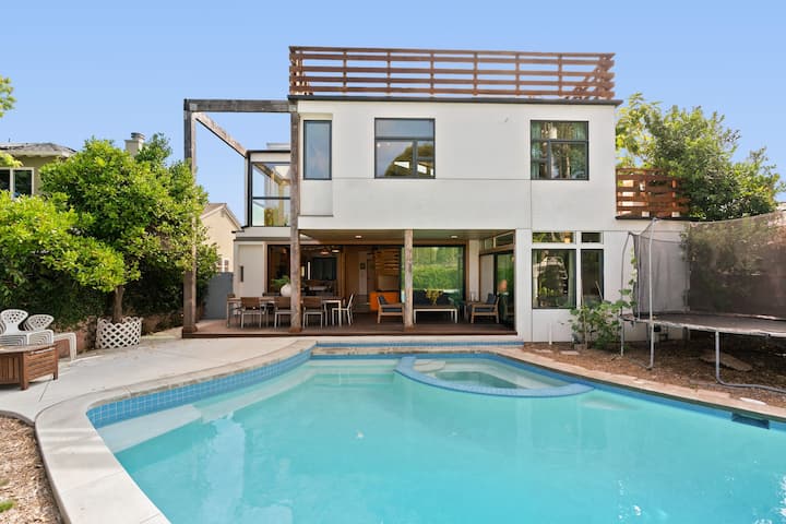הבית המודרני והמוזר הזה, שעוצב על ידי האדריכל דייב סלרס, ממוקם במיקום אידיאלי בסנטה מוניקה, במרחק קילומטר וחצי מחוף הים, וקרוב לרחוב הראשי של סנטה מוניקה, לחוף וניס ולאבוט קיני. ברחוב ללא מוצא הבית נמצא ליד פארק גדול עם מגרשי טניס, מגרש משחקים ומרחק הליכה למגרש גולף ו -20 דקות הליכה לחוף הים. תקרות גבוהות, המון אור עם בריכה פרטית וג'קוזי. הבריכה שופצה במלואה ב -2022 והבית נבנה מחדש מהצמחים ב -2019.