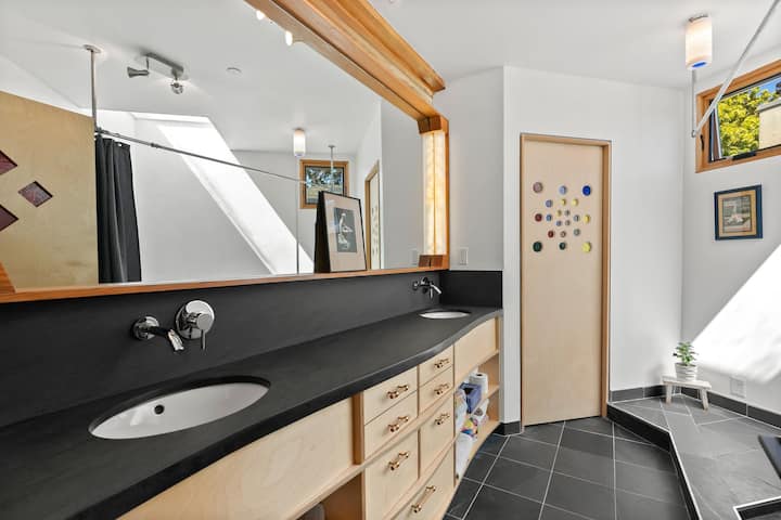 זה הבית הראשי שלנו. ארון חדר השינה הראשי והמזווה אינם נכללים בהשכרה. המוסך גם לא נכלל, ומכיל את החפצים האישיים שלנו. בדרך כלל אנחנו משאירים לאורחים לפחות מקום חניה אחד פנוי. הבית שלנו מוגדר כבית האישי שלנו, הבית הוא מרחב יצירתי מאוד ו"עבודה בתהליך ". הוא מצויד היטב ותמצאו חפצים אישיים שלנו בכל הבית. כתוצאה מכך יש מקום מוגבל בארון ובמגירה לאורחים. כמו כן, יש כמה פגמים בבית שיש לציין: