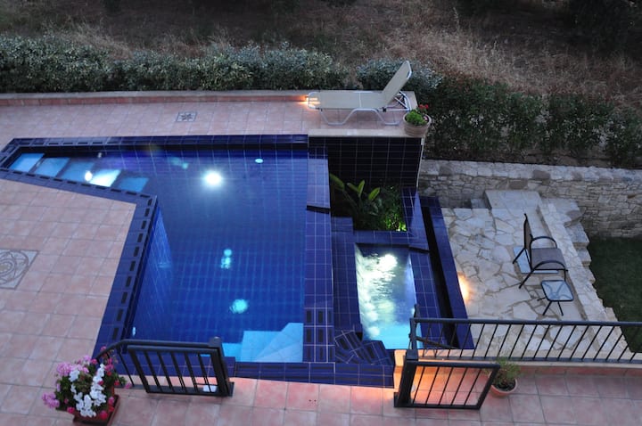 כמו כל הבתים בווילה Koukouvayia Farm, יחד עם חצר וגינה פרטיים משלה, בית ההארחה חולק את הבריכה העמוקה של החווה, שמפל המים שלה מזין אזור התזה לפעוטות, וכולל, ללא תשלום, משחקי לוח ודשא, אופניים וציוד חוף למקרה שיצטרכו לצאת לטיולים.