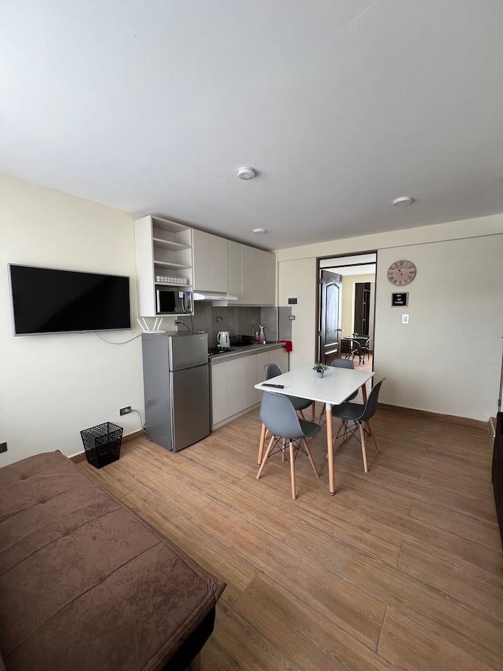 בצד המטבח תוכלו למצוא סלון קטן עם שולחן אוכל עם 4 כיסאות, יש בו גם ספה וגם טלוויזיה חכמה עם מסך שטוח 40 אינץ'