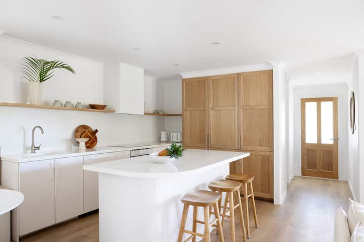 מרכז הבית הוא ספסל האבן המעוקל במטבח המודרני הגדול, המצויד במלואו במכשירי חשמל איכותיים ובמתקני בישול. יש פינת אוכל ושיחה עכשווית עם ספסל ישיבה משולב למפגשים מזדמנים.