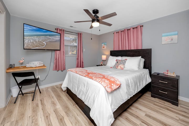 🛏 מיטת קווין סייז | שולחן | טלוויזיה חכמה 50 אינץ' עם רוקו | מאוורר עם שלט רחוק | ארון עם קולבים, מראה, סדינים ושמיכות נוספים