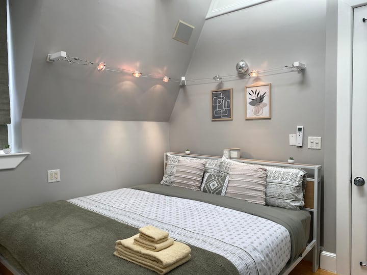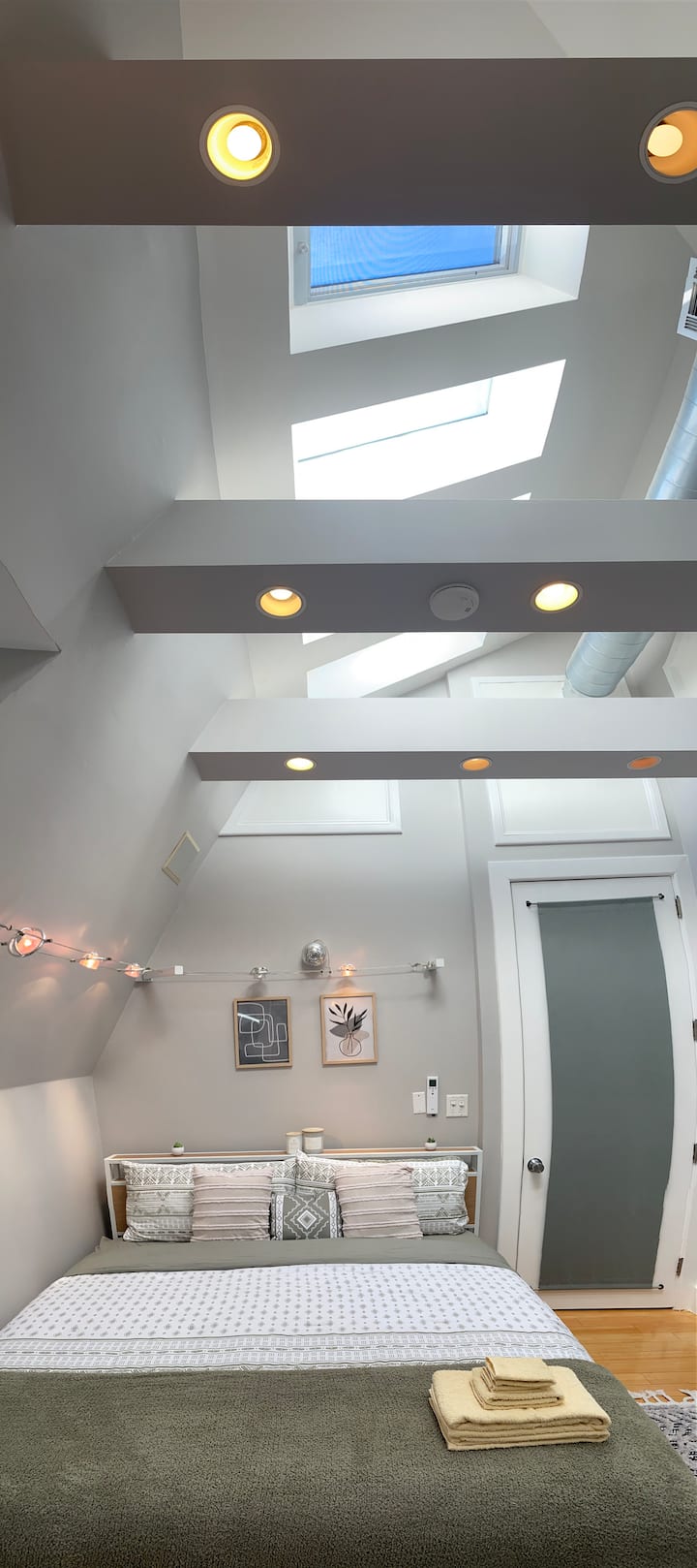 מיטת קינג סייז בחדר נעים עם זרקורים