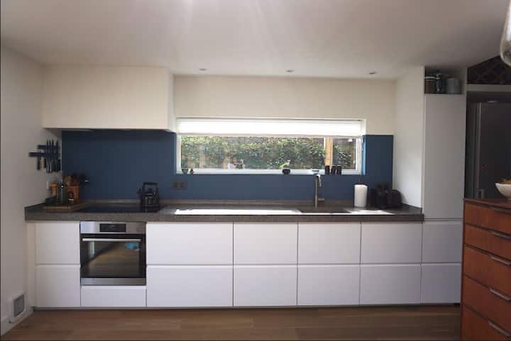 * מטבח פתוח ושטוף שמש (מאובזר במלואו) עם סקיילייט, חימום תת רצפתי, שולחן אוכל גדול (6 אנשים) עם 2 כיסאות אוכל ודלתות פטיו כפולות לגינה האחורית.