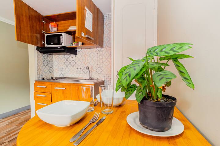 Este encantador Apartamento forma parte de 45 hermosos y cómodos apartaestudios completamente independientes. Totalmente amoblado y preparado para 2 personas (capacidad máxima), contaras con una cama doble, baño privado, y una cocina eléctrica equipada con todas las herramientas básicas necesarias para la preparación de tus alimentos. Así mismo contaras con un juego de lencería para tu cama y toallas para los huéspedes, productos de aseo personal como papel higiénico y jabón líquido para el cuerpo.