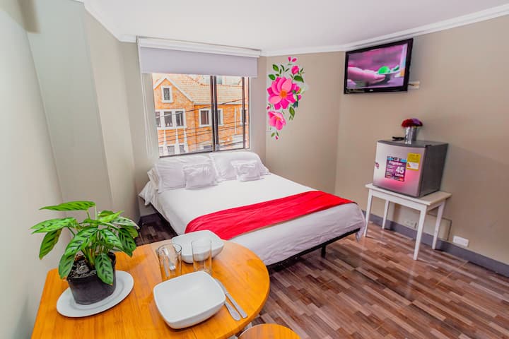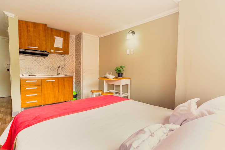Hermoso e iluminado aparta-estudio para 2 personas. Ubicado en el barrio TEUSAQUILLO, una zona emblemática y central con fácil acceso a teatros, transporte público, centros culturales, paseos, parques, museos, restaurantes… Incluye estacionamiento e Internet WIFI SUPER FAST. PERFECTO para parejas, familias y/o aventureros solitarios que quieran estar en Bogotá desde un lugar central y seguro. ¡Estándares de limpieza, desinfección del espacio y recepción las 24 horas! (Con PROTOCOLOS COVID 19).
