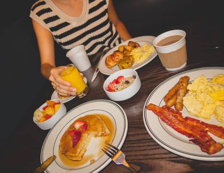 — עמלת ארוחת בוקר בסך $ 24 + מס על ארוחת בוקר קונטיננטלית ו - $ 36 + מס על מזנון ארוחת בוקר אמריקאי מלא