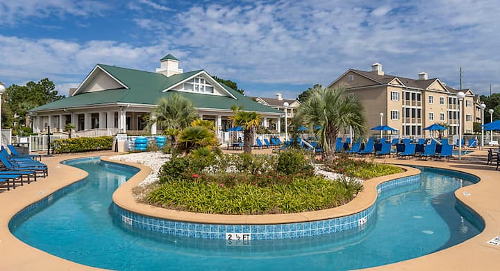 Situated along the Intracoastal Waterway in Myrtle Beach just minutes from the surf, Harbour Lights™ is the perfect place to base yourself from as you explore everything this seaside destination has to offer. Hotel Rooms, One- and two-bedroom suites and villas are perfect for family stays at this resort, where colorful pastel buildings, nautical villa décor and a wrap-around porch at the clubhouse exude a beachy, low-country charm.