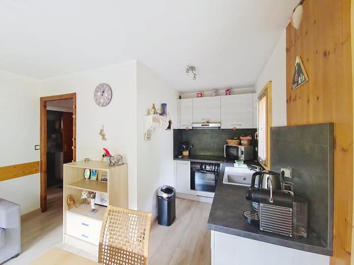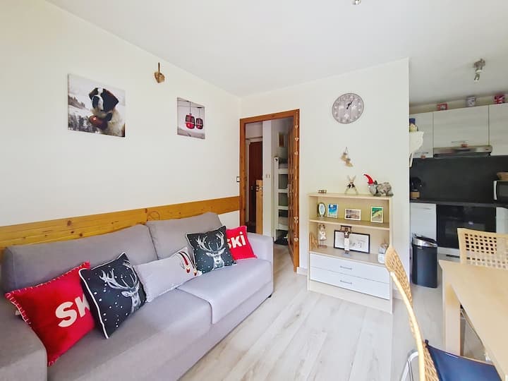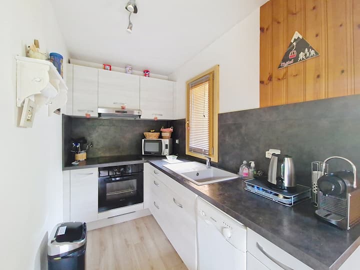 Cosy 3* 31 m2 בקומה השלישית. סלון עם טלוויזיה עם מסך שטוח. מטבח פתוח עם כיריים קרמיים, מקרר, מדיח כלים, מכונת קפה נספרסו, תנור, קומקום, מיקרוגל וטוסטר.