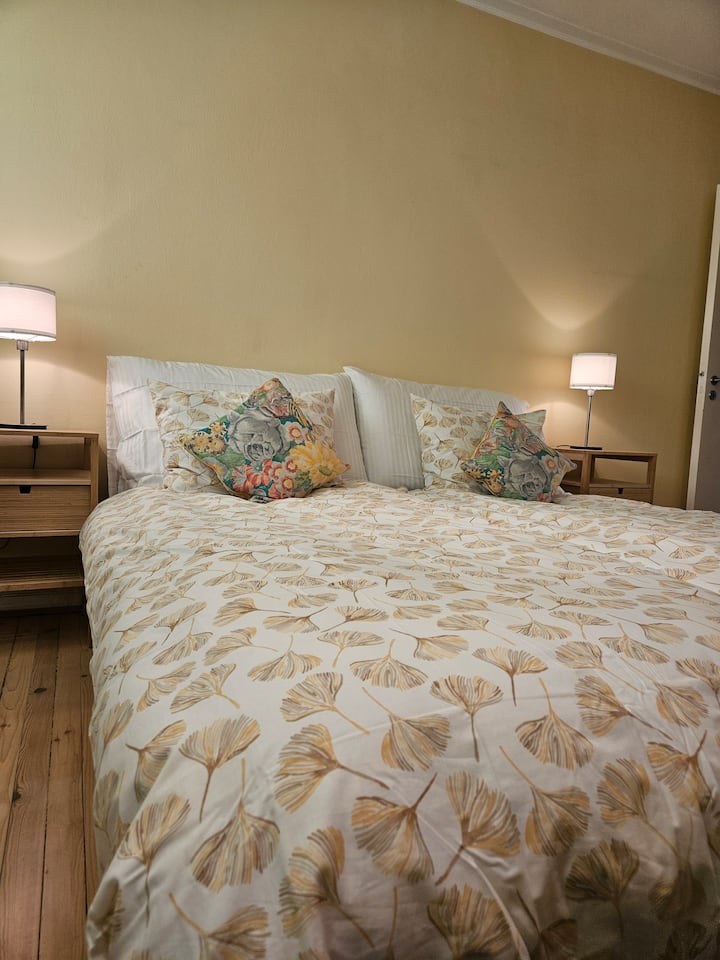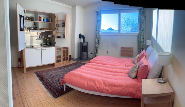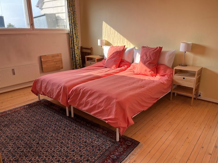 המיטות הזוגיות פירושן שניתן לדחוף את 2 המיטות יחד לזוג, או להפריד ביניהן כדי ש-2 חברים יוכלו להישאר. החדרים נמצאים בדירה מאווררת, מוארת ונוחה משנות ה -30 בקומה 4 (ללא מעלית), מעוצבת בסגנון מודרני עם כל המתקנים. בכל החדרים יש חימום משלהם; חדר שינה עם רדיאטור (בתוספת תנור עצים, אם אתם יודעים איך להשתמש בו) וחדר רחצה עם חימום רצפה. בדלת חדר השינה אין מנעול. הנוף מחלון חדר השינה הוא מעל הפיורד והאיים.