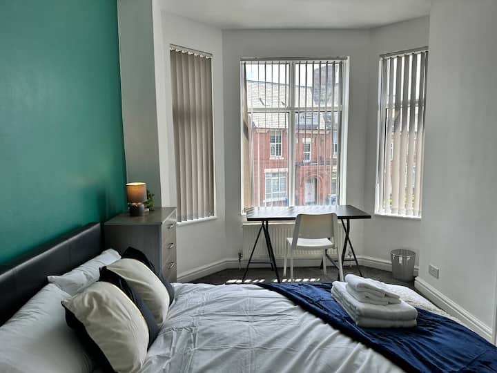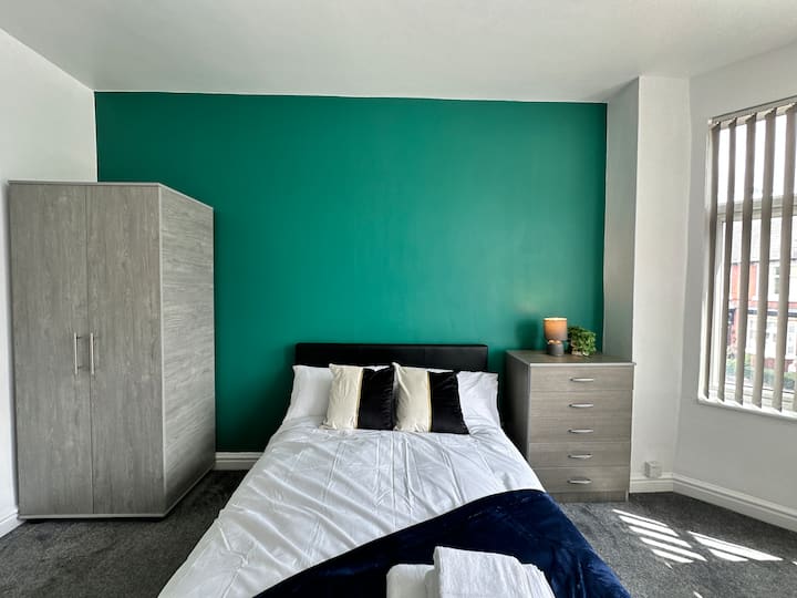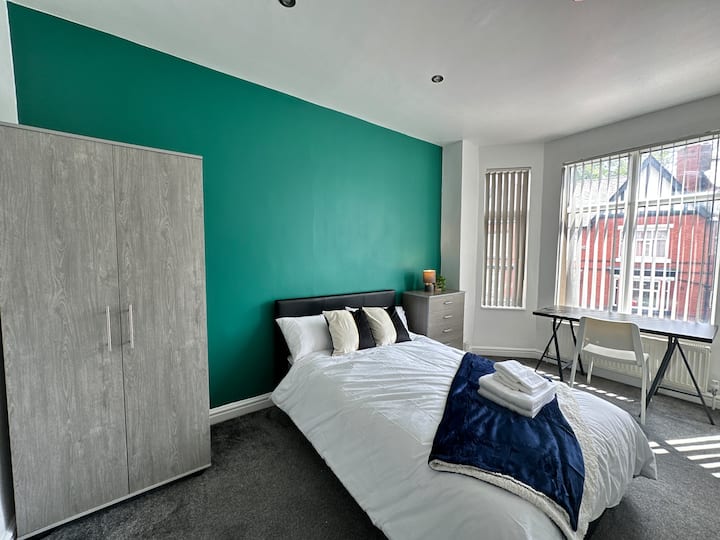 חדר שינה פרטי נוח עם חדר רחצה צמוד בבית המשותף שלנו בן 5 חדרי השינה, ממש מחוץ למנצ'סטר הסואנת, המוצג על ידי Bubble Rooms בשיתוף עם Staycasa Accommodation. בכל חדר יש מיטות נוחות, המבטיחות שינה נינוחה.