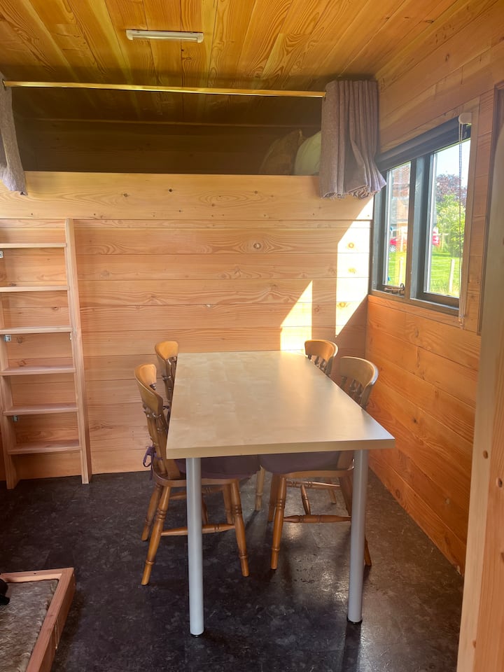 מיטת קינג סייז סופר ושתי מיטות יחיד על קומת ביניים מעל חלל האוכל. סולמות אנכיים מובילים למעלה, קצת הרפתקני אבל שווה את זה!
