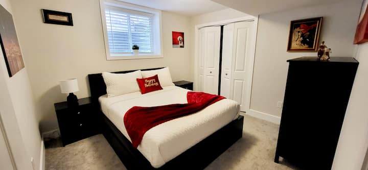 חדר שינה מרווח/ מסודר עם מיטת קווין סייז.