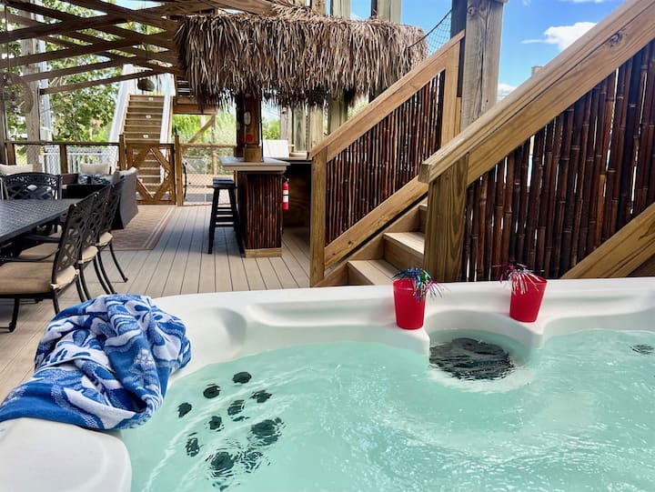 חלל מגורים בקומת הקרקע: מוכנים להתפעל? מתחת לבית המקושט (20 רגל), אתם וחבריכם/בני משפחתכם תיהנו מחלל מגורים חיצוני פרטי להפליא. ספה גדולה, שולחן אוכל עם 8 מושבים נוחים, ג'קוזי ובר Thirsty Turtle!