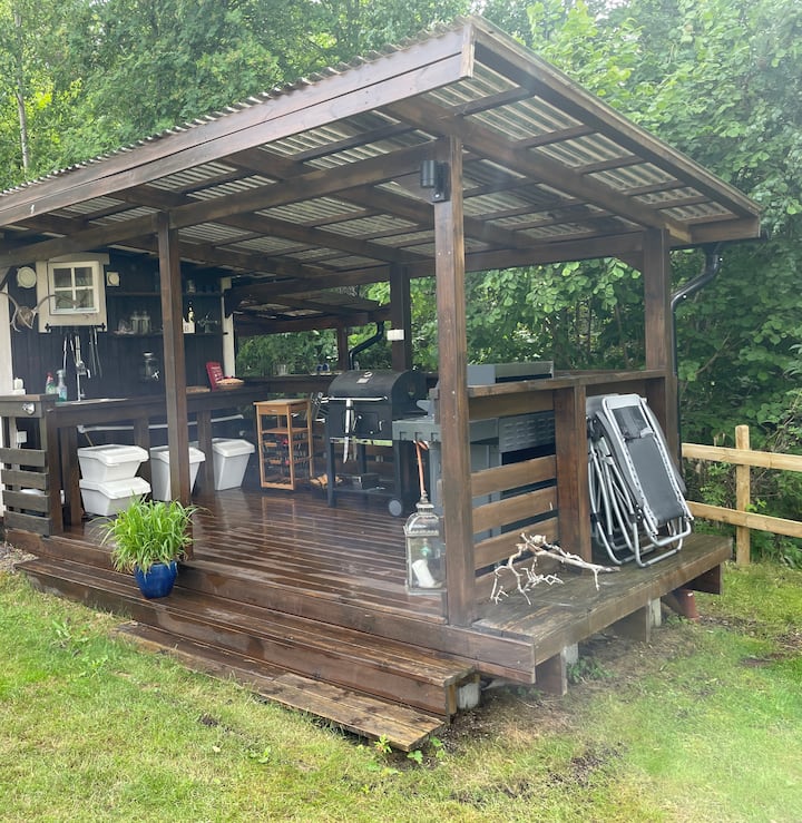 מטבח חיצוני גדול זמין להרפתקאות קולינריות מתחת לשמיים החשופים. לרשותכם גריל פחם עם לבניות פחמים/ברביקיו וכריות הצתה. יש גם גריל גז אם אתם מעדיפים.