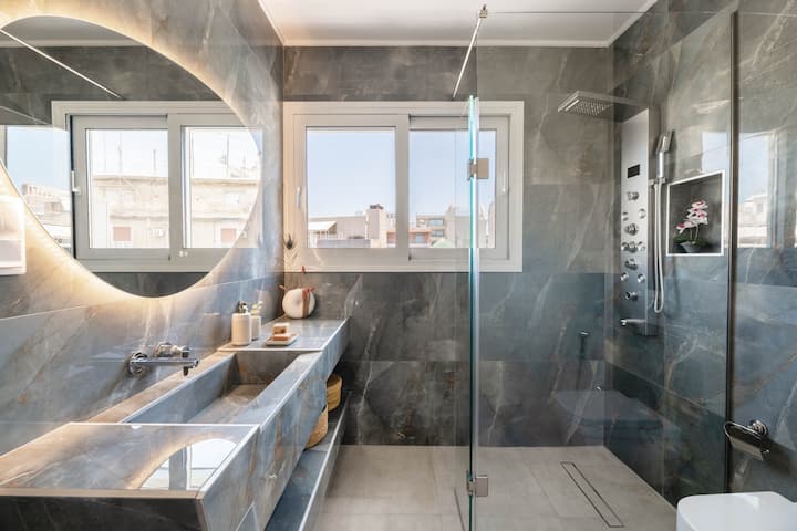 להתפנק בחוויה דמוית ספא עם שני חדרי אמבטיה מלאים, כל אחד עם אריחים מהרצפה עד התקרה. חדר הרחצה הראשי מציע חוויה ייחודית עם נוף לאקרופוליס בזמן המקלחת. בשני חדרי הרחצה יש מקלחת מפוארת, שירותים ויהירות גדולה.