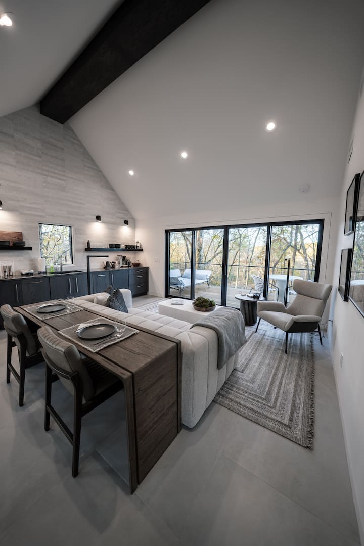מהרגע "Better Together" נראה לעין, זה יעצור את נשימתכם. החלק החיצוני מכוסה בציפוי יפני של שו סוגי באן, ומעניק לו מראה מודרני שחור - על שחור דרמטי החבוי ביער. אתם נכנסים לבית דרך בריזוויי קלאסי של דוגטרוט שנפתח אל דק עץ ברזילאי רחב ידיים עם נוף מרהיב לשקיעה הפונה מערבה ומקלחת אל - פרסקו. על מרפסת קטנה צמודה יש ג'קוזי חימום עץ (חוויה חוץ חושית) ונותן תחושה שאתם צפים ביער. בחלל הפנימי יש שני אזורי מגורים ששווים יותר מ -600 רגל רבוע ומעוצבים עם ריהוט אסתטי ומעצב מודרני. משמאל המטבחון והסלון המאובזרים, ומימין נמצאים חדר השינה וחדר הרחצה עם ראשי מקלחת כפולים ורצפות מחוממות. בשני האזורים יש נוף מערבה עם דלתות הזזה גדולות שמובילות החוצה, ומזמינות אתכם להתחבר לטבע סביבכם.