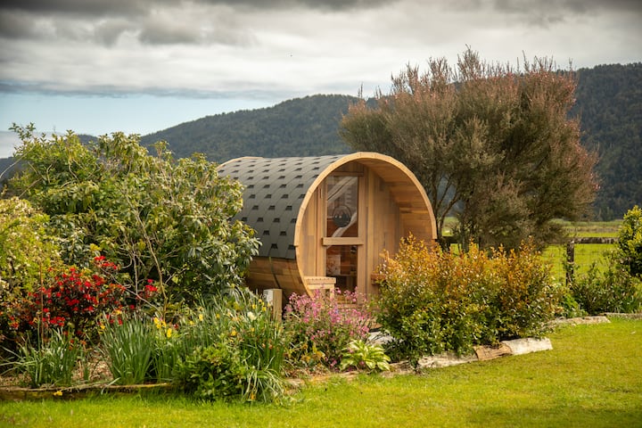 בקתה נוחה בהר עם סאונה בצורת חבית בקרבת קרחון פוקס
