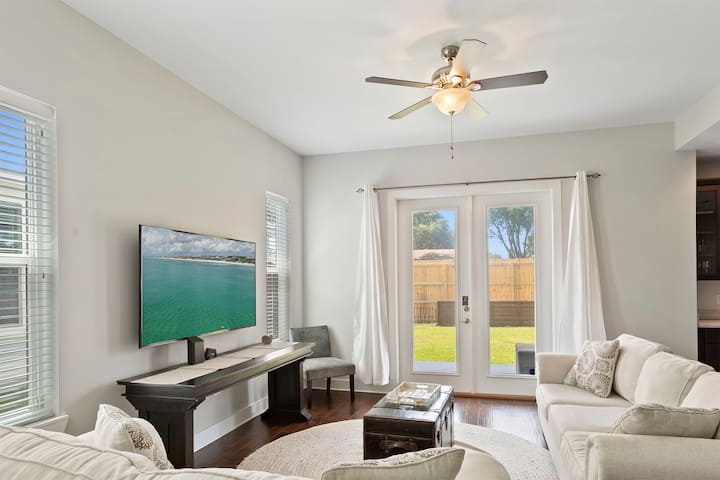 כונן פייבר מקבל את פני האורחים עם הגעתם, ואילו גינון הדשא מנוקד בצמחים טרופיים מזמין אתכם לגן עדן. הקומה הראשונה מוקדשת לחדר הגדול הפתוח וחדר שינה אחד לאורחים. חלונות גדולים יוצרים פנים שטוף שמש, ורצפות עץ עשירות מוסיפות אלגנטיות לחלל. הסלון כולל ספה בצבע שמנת ומושב אהבה תואם הפונה לטלוויזיה עם מסך שטוח גדול. בסמוך לסלון נמצאת פינת האוכל המזדמנת עם שולחן בצבע שוקולד ומקומות ישיבה לשישה אנשים. רצפות עץ מחליפות לאריחים בגוון קלף במטבח הפתוח. המטבח מודרני, ומתגאה בארונות כהים, ארונות עם חזית זכוכית, משטחי קוורץ מלוטשים, תאורת תליון, מכשירי נירוסטה וקיר מבטא עם אריחים גיאומטריים. אי המטבח עם שני כיסאות מוגבהים משמש כבר ארוחת בוקר נוח. מהחדר הנהדר הזה, לאורחים יש גישה לחצר האחורית ולמרפסת הפרטית. המרפסת מקושטת בריהוט חיצוני. זה מקום נהדר לבלות זמן פנוי עם הנופשים האחרים, ללגום קוקטייל מרענן ולהירגע.