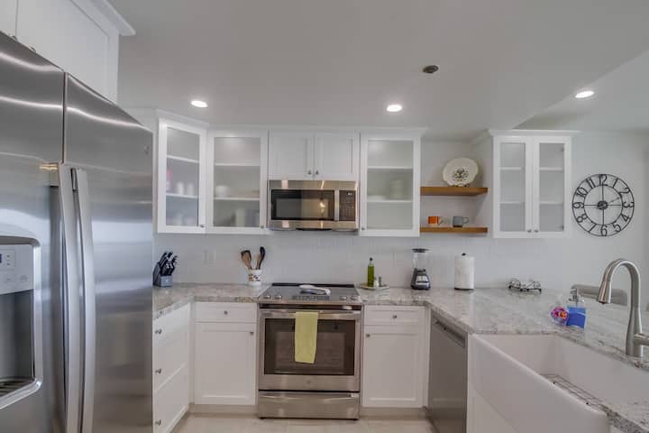 העיצוב של הדירה הזו גם נוטה לכיוון בית חווה עם ריהוט מודרני ומתחשב כמו אח גז מאבן ועץ וכיור מטבח של בית חווה. במטבח המצויד במלואו יש מכשירי נירוסטה חדשים, כולל מסנן מים במקרר הדו - דלתות, כיריים חשמליות, מדיח כלים, ארונות חלונות, מגירות איטיות ומשטחי גרניט מפתים שנמשכים לאורך בר הקפה הסמוך ובחדר הרחצה. גם בזמן שאתם מכינים ומבשלים ארוחות במטבח, אתם יכולים לראות את השקיעה מקשטת את אופק המפרץ בסוף היום.