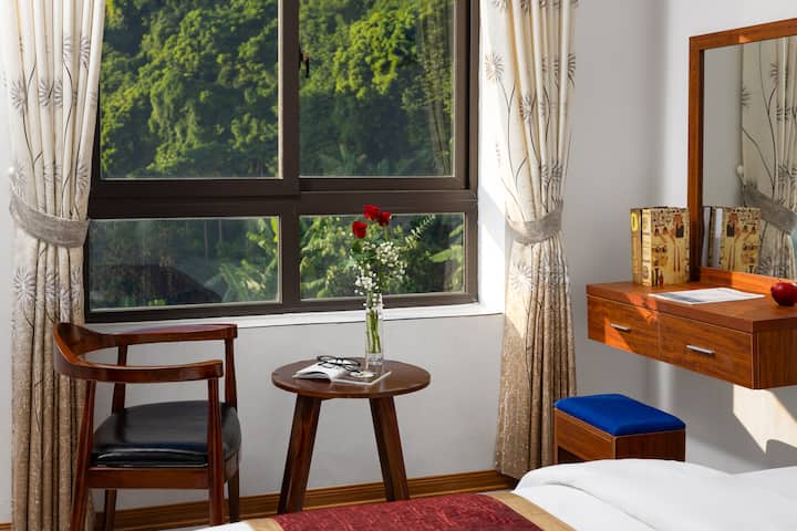 חדר שינה אחד עם נוף להרים וחלון - מלון Quang Tung