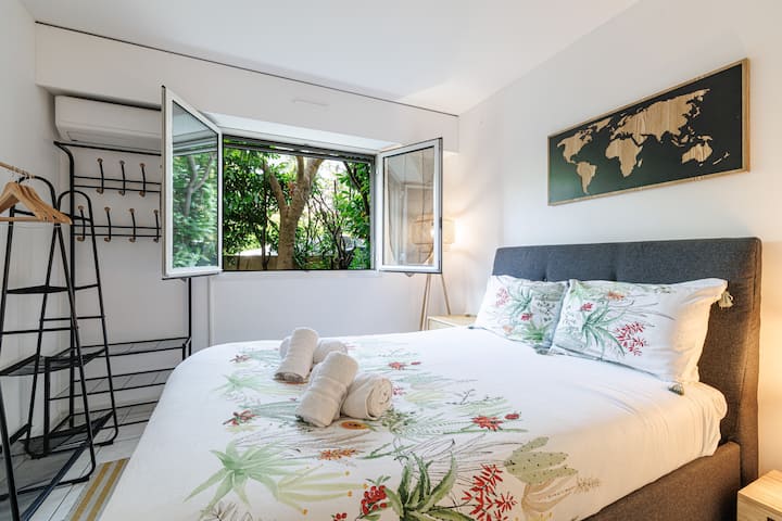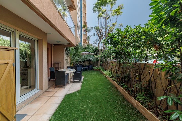 דירת שני חדרים יפה עם גינה • בריכה • חניה • מיזוג אוויר