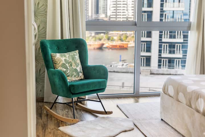 דירת 2 חדרים עם מיטת קינג סייז ונוף למרינה