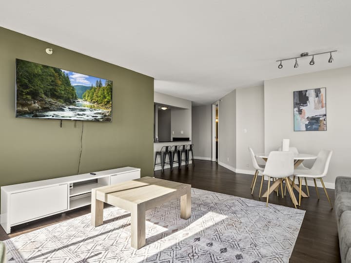 סלון: להירגע בסלון האלגנטי, הכולל ספה מפוארת, כיסא נוי, טלוויזיה עם מסך שטוח בגודל 55אינץ ', שולחן קפה ופינת עבודה ייעודית עם כיסא נוח.
