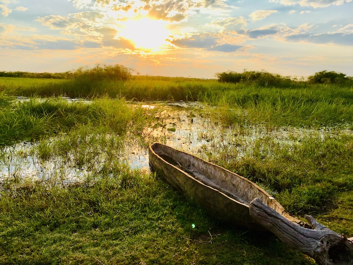 צריף אפריקאי מסורתי פנורמי עם מיטת קינג סייז, תחנת קפה ומקרר קטן. לישון עם צלילי הדלתא ולהתעורר לזריחה מעל מישורי השיטפונות. זה לוקח רק הליכה קטנה לשירותים שלכם דרך גינת הירק.