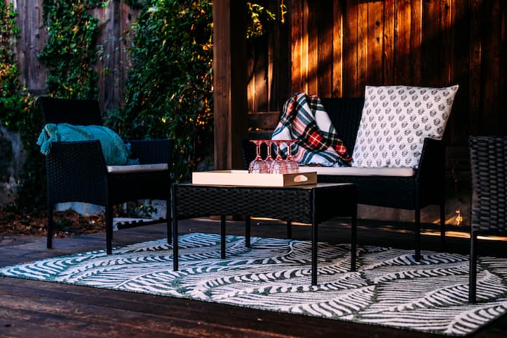 יש לנו חצר אחורית פרטית מאוד, מגודרת, "גן סודי" עם פטיו מכוסה, מקומות ישיבה בחוץ ותאורת קפה. למרות שאנחנו כמה רחובות מהכביש המהיר, השכונה שלווה ואף פעם לא שומעים שום צליל כשאתם בפנים.