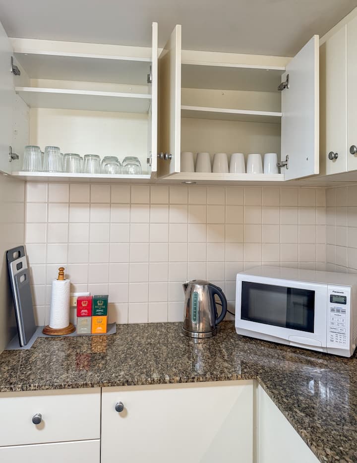 - מטבח: מצויד במכשירים חיוניים (מקרר, מיקרוגל, תנור, קומקום, טוסטר) וכן בכלים, שמן בישול ותבלינים.