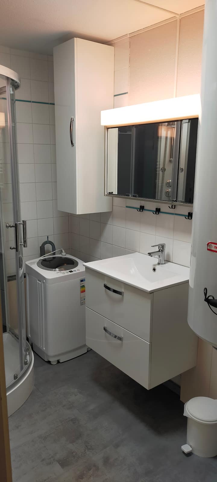 חדר מקלחת עם תא מקלחת פינתי, כיור יחיד, יחידת איפור, מייבש מגבות, יחידת אחסון, מכונת כביסה מיני בגודל 3.50ק"ג, מייבש שיער.