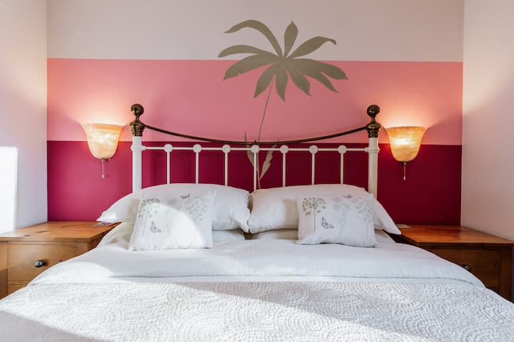 למעלה יש חדר שינה נעים עם מיטת קינג סייז וחדר רחצה מאובזר היטב.